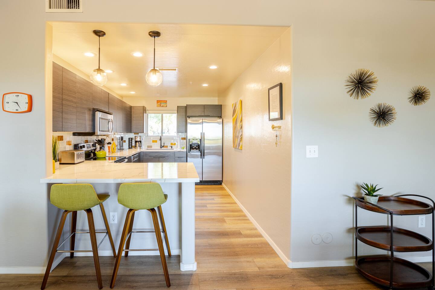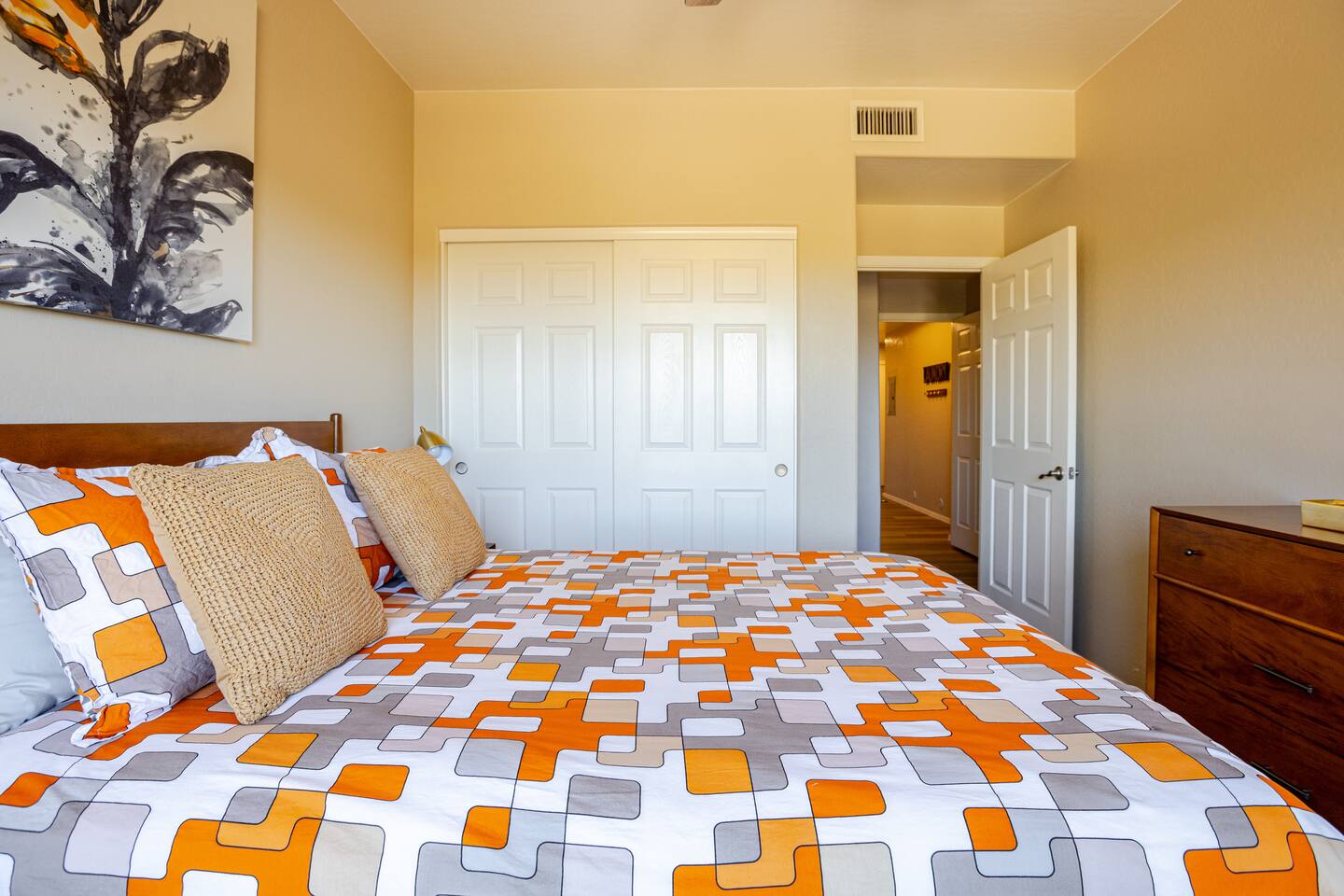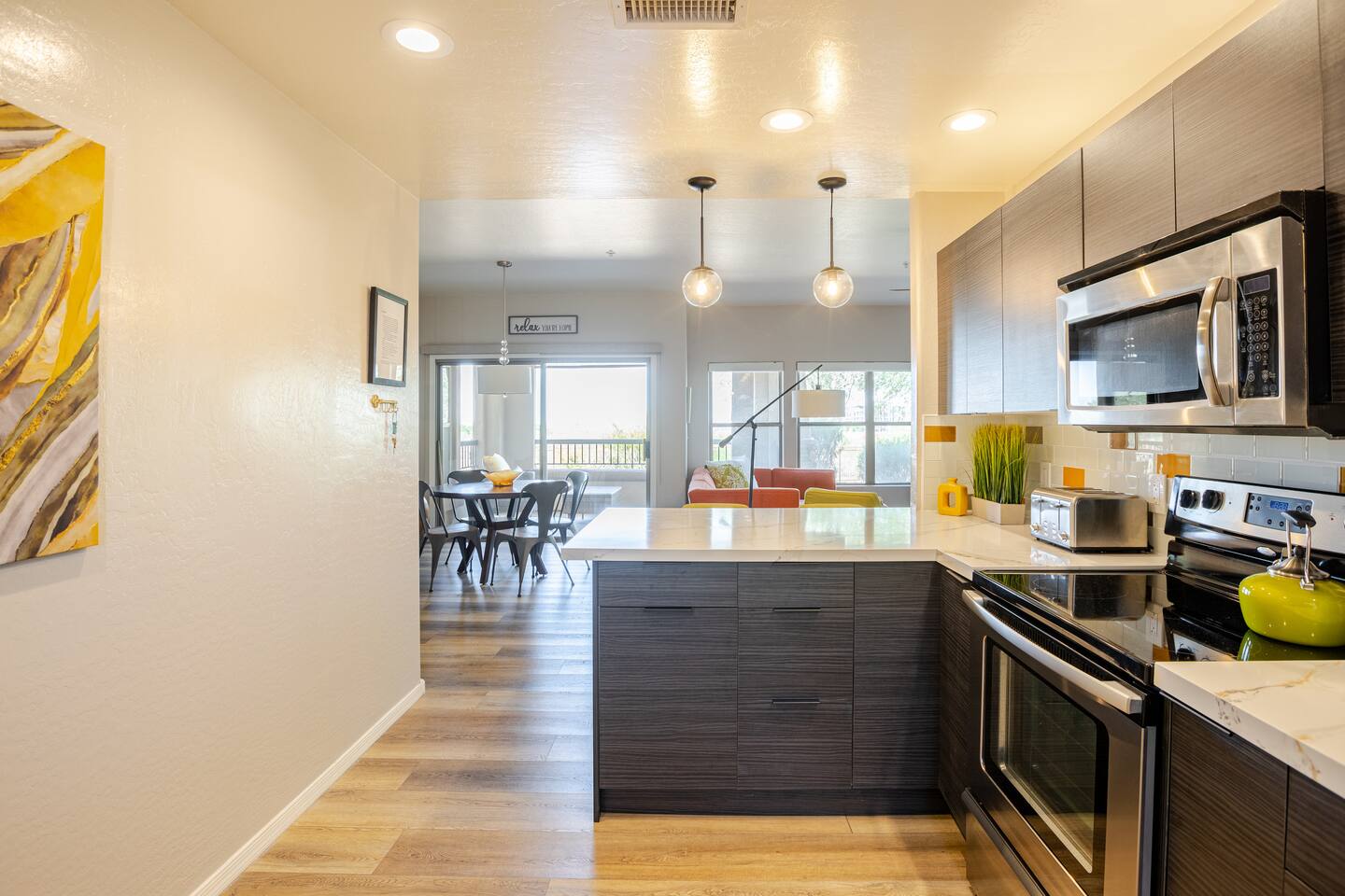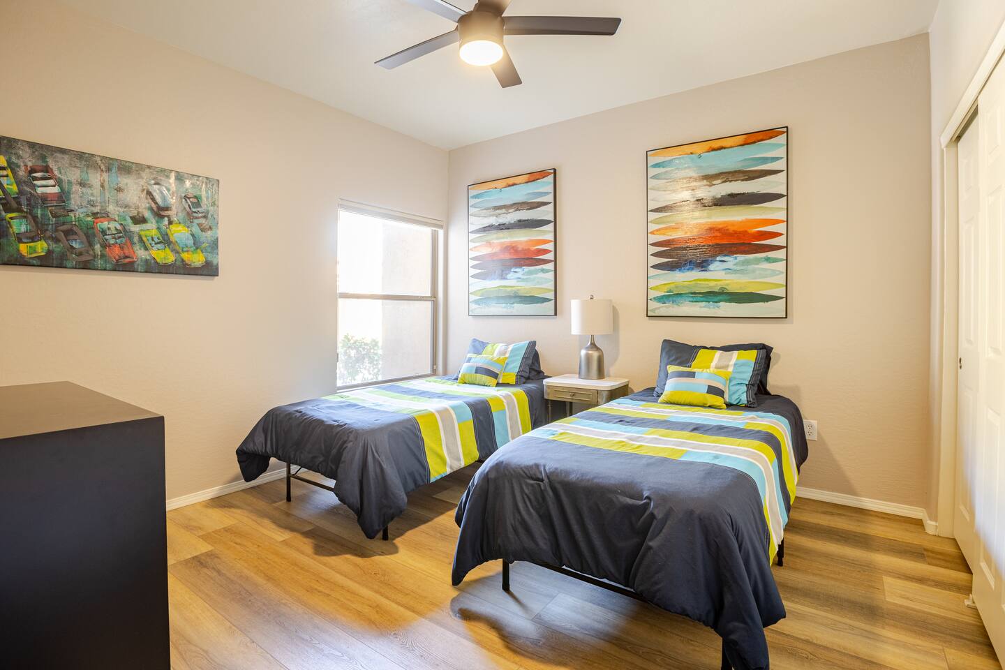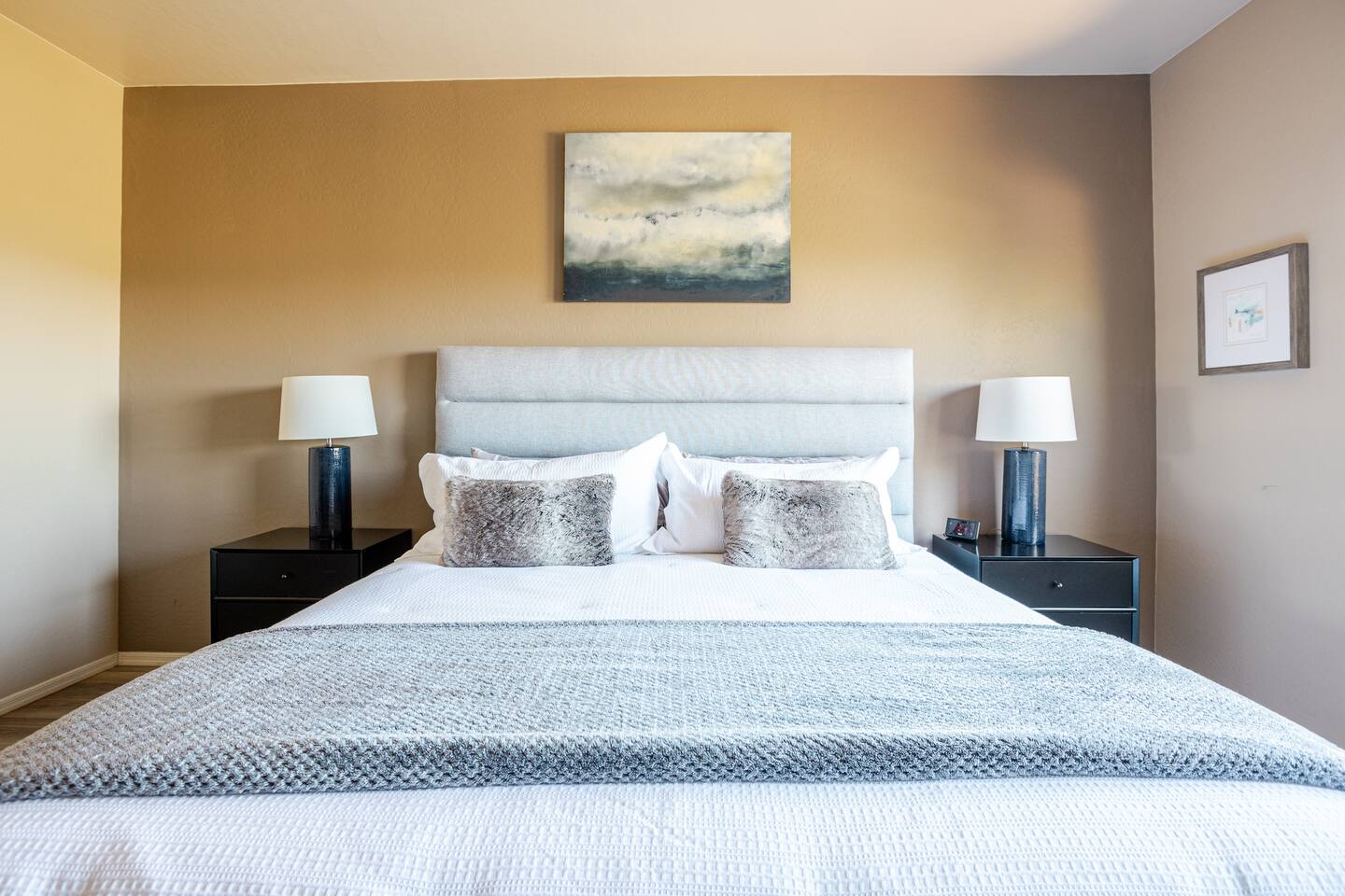 Welcome to your 1,729 sq ft Scottsdale sanctuary, where stylish mid-century design meets modern comfort. The open-plan living area is perfect for relaxation, and the private furnished balcony offers a chance to enjoy the fresh Arizona air. This condo comfortably sleeps six guests. Bedroom Configuration: * Master Bedroom: A spacious retreat with a king-sized bed, an ensuite bathroom featuring a jetted tub, and a dedicated workspace. * Guest Bedroom 1: A cozy room with a queen-sized bed. * Guest Bedroom 2: Features two extra-long twin beds, perfect for kids or friends. Amenities Provided: * Fully equipped kitchen with all cooking necessities. * Fresh linens, bath towels, and pool towels. * In-unit laundry room with a washer, dryer, and iron. * Hair dryer. * Family-friendly items: A porta-crib and booster chair are available for your little ones.