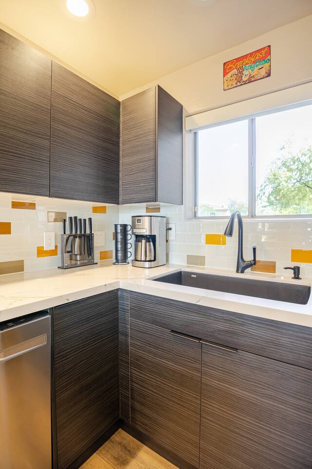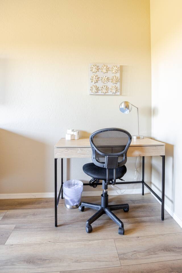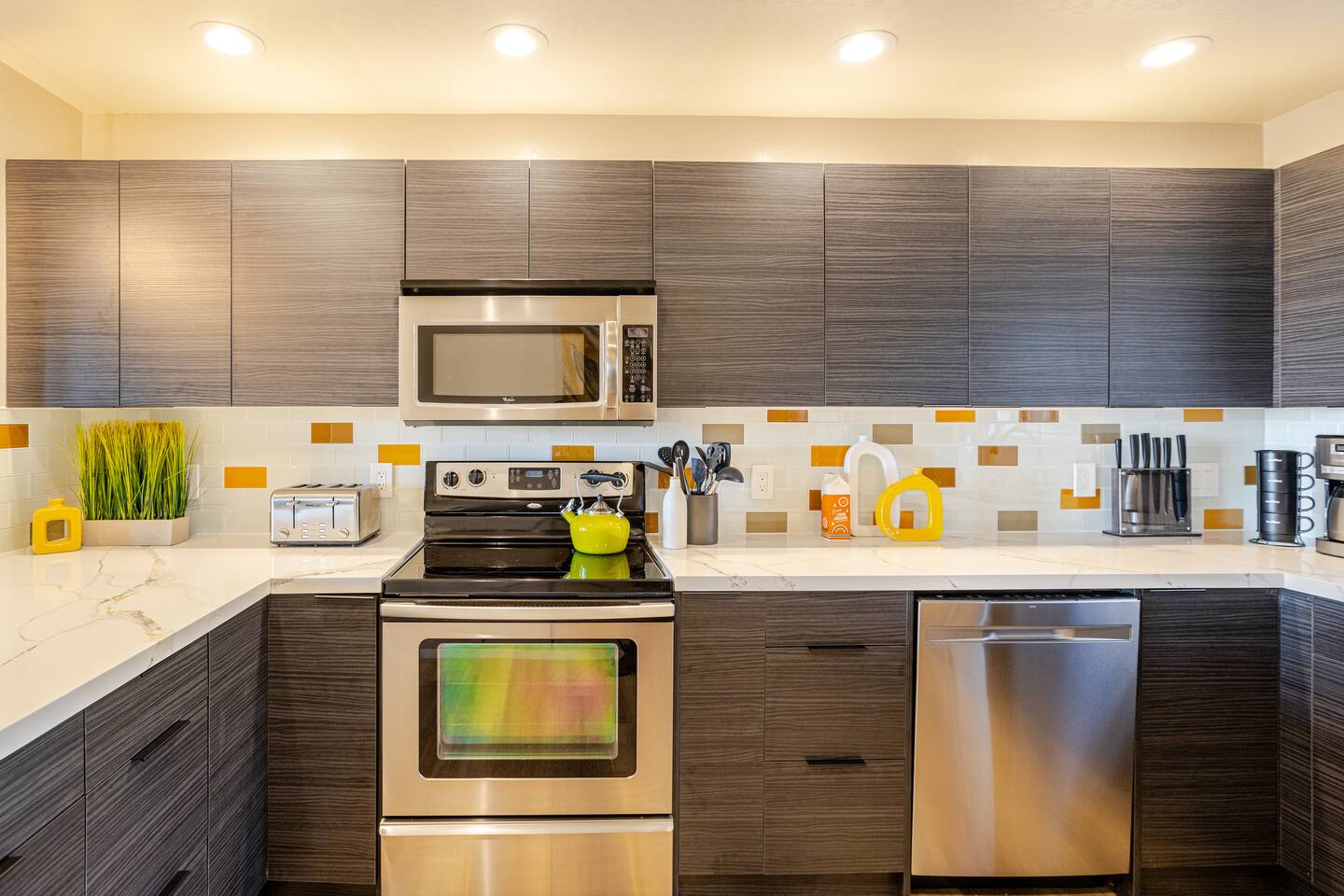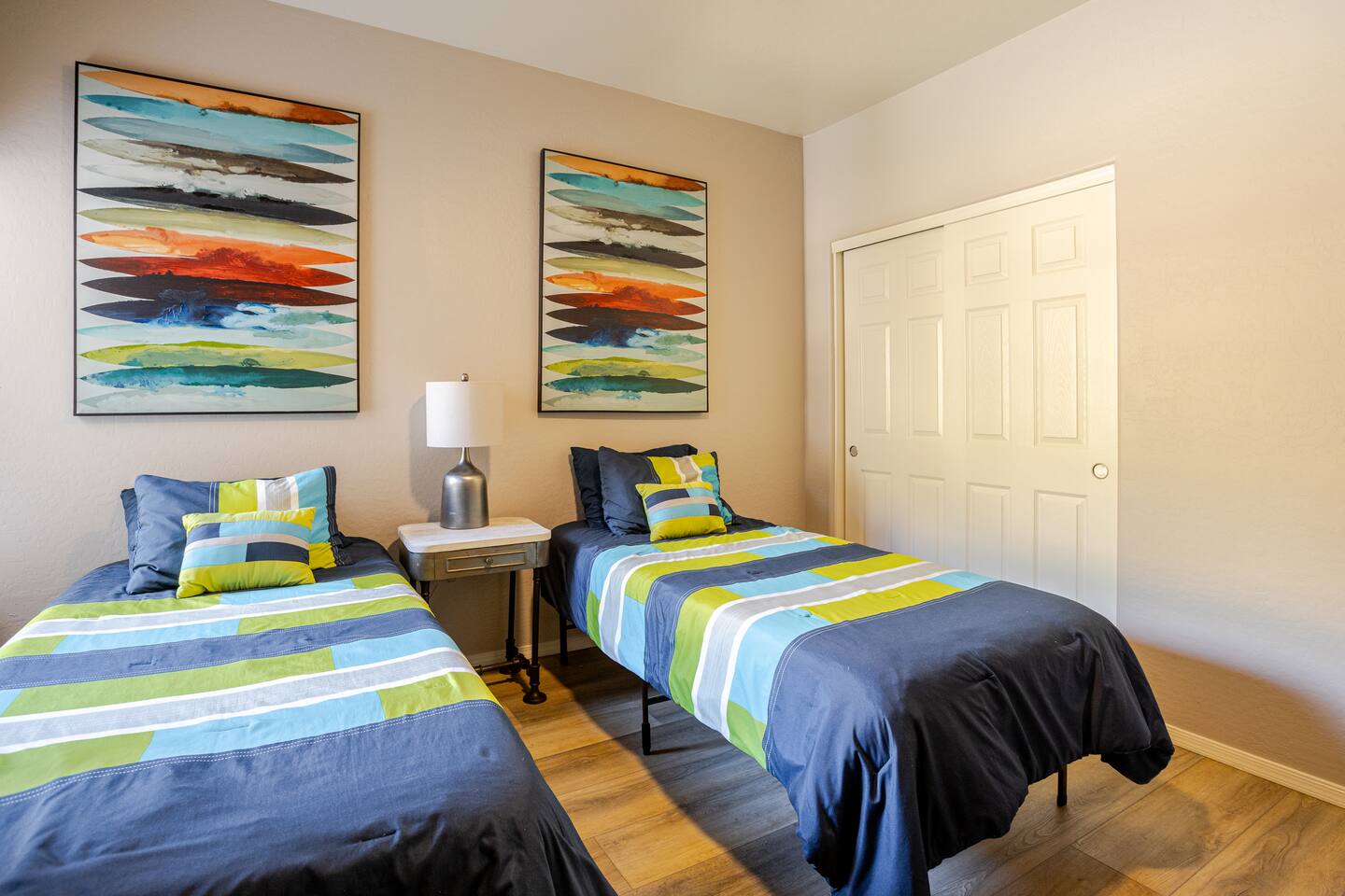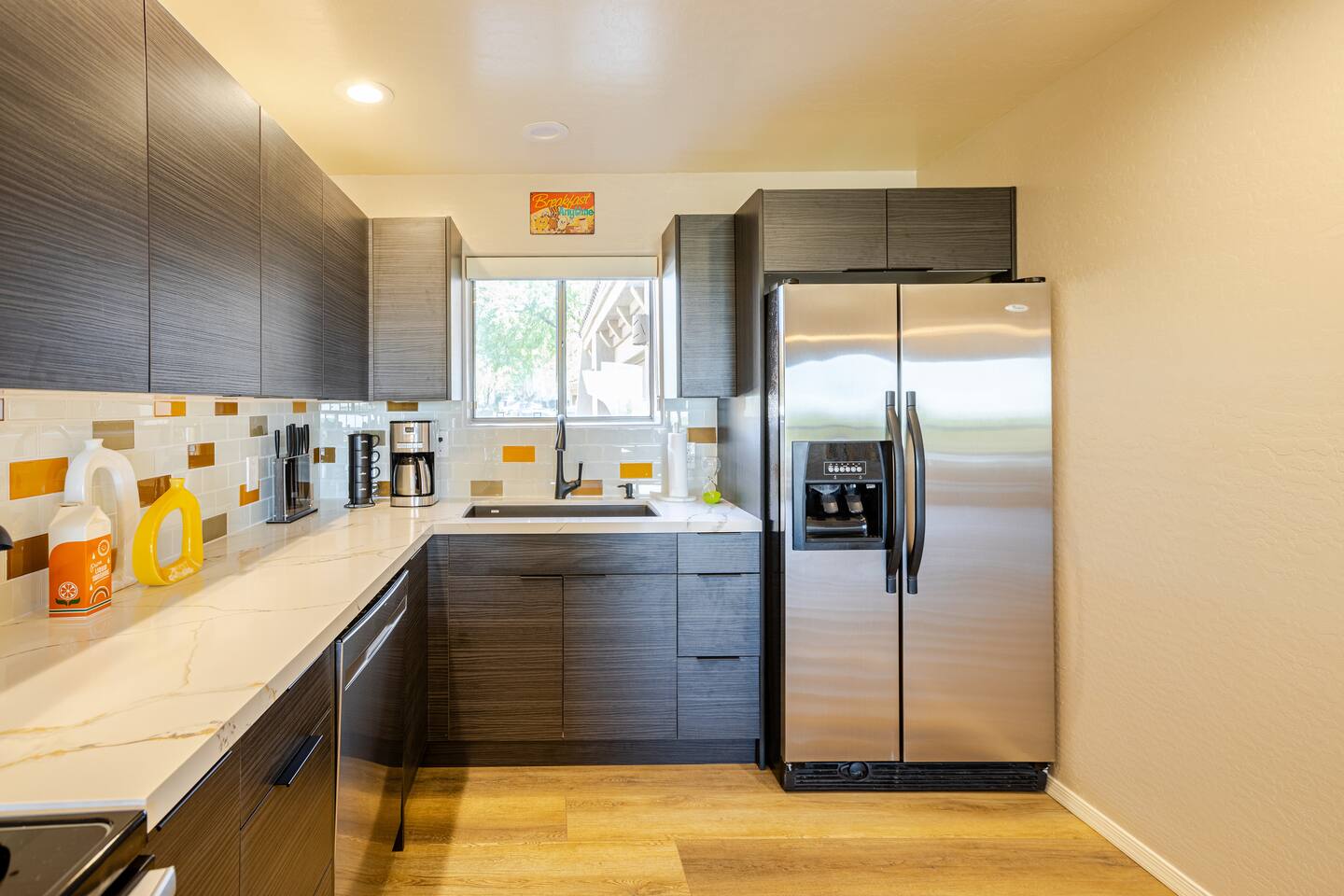 Welcome to your 1,729 sq ft Scottsdale sanctuary, where stylish mid-century design meets modern comfort. The open-plan living area is perfect for relaxation, and the private furnished balcony offers a chance to enjoy the fresh Arizona air. This condo comfortably sleeps six guests. Bedroom Configuration: * Master Bedroom: A spacious retreat with a king-sized bed, an ensuite bathroom featuring a jetted tub, and a dedicated workspace. * Guest Bedroom 1: A cozy room with a queen-sized bed. * Guest Bedroom 2: Features two extra-long twin beds, perfect for kids or friends. Amenities Provided: * Fully equipped kitchen with all cooking necessities. * Fresh linens, bath towels, and pool towels. * In-unit laundry room with a washer, dryer, and iron. * Hair dryer. * Family-friendly items: A porta-crib and booster chair are available for your little ones.